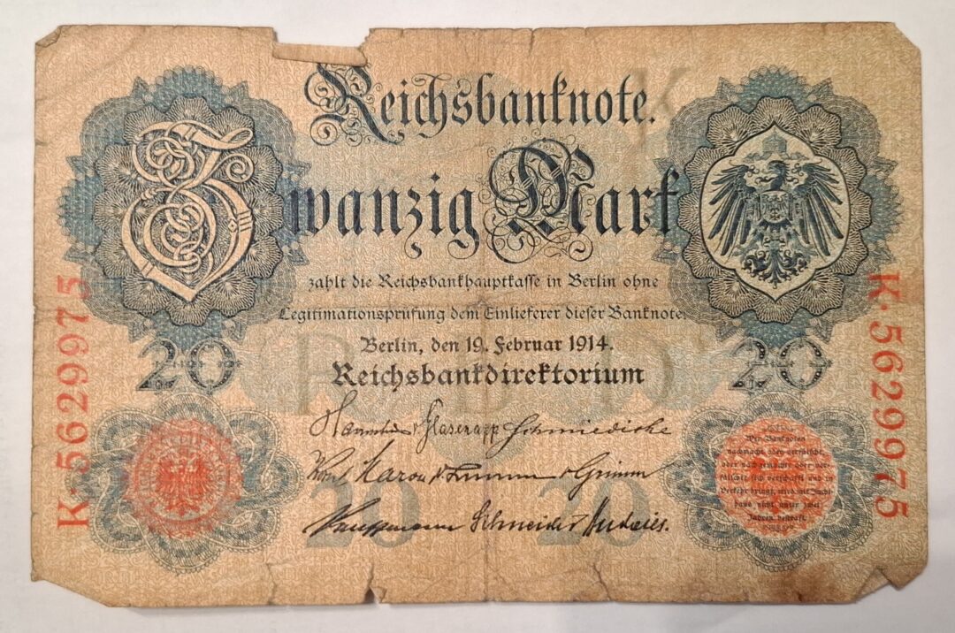 Stary Banknot kolekcjonerski Niemcy 20 marek 1914