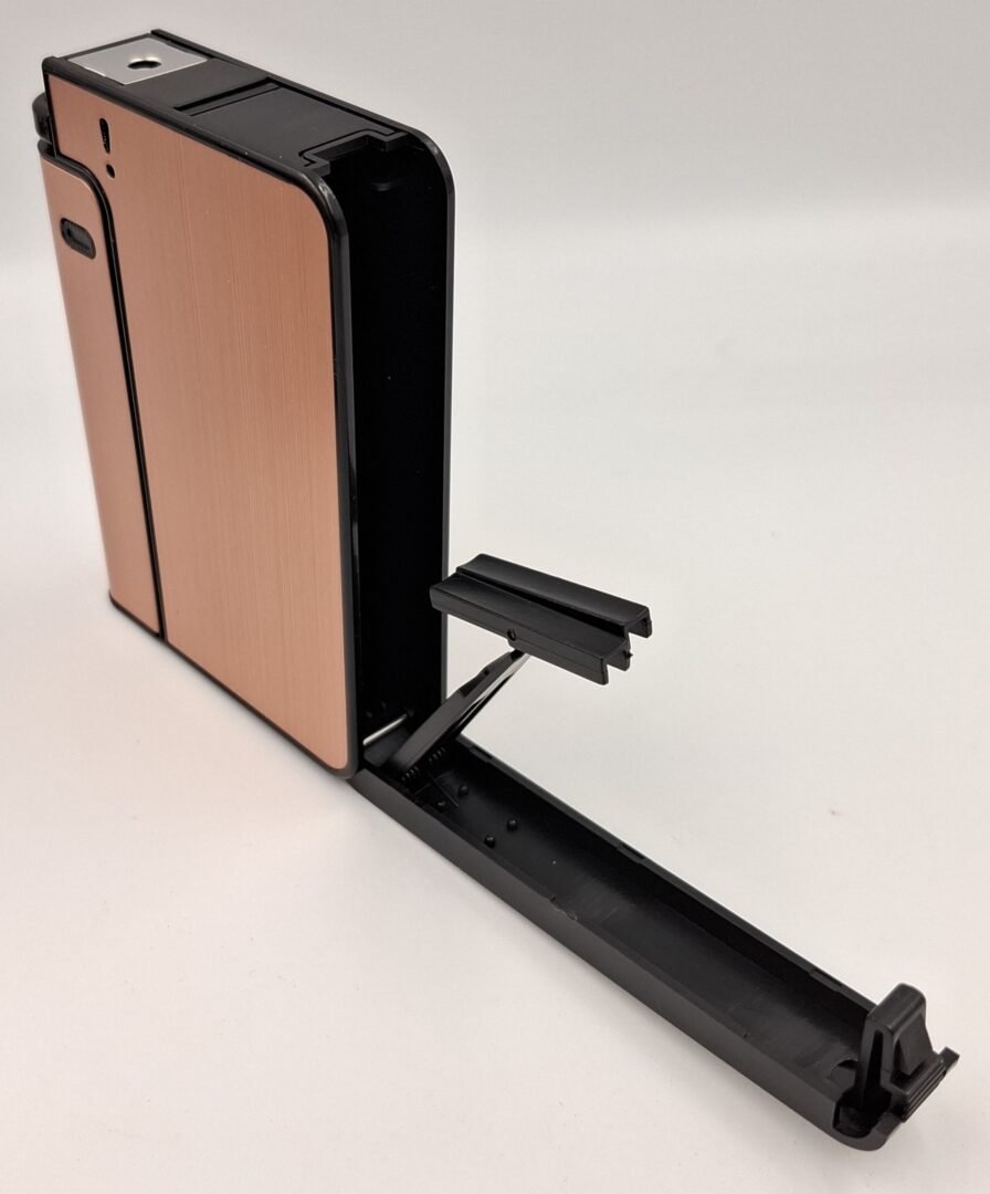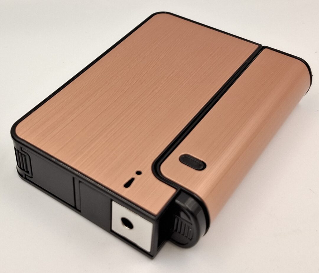 Produkt jest nowy. Oferta dotyczy eleganckiej papierośnicy. Ma ona miejsca na zewnętrzną zapalniczkę ale nie mam pojęcia jaką. Myślę, że mieści 10 papierosów ale pewności nie mam bo nie sprawdzałem. Po włożeniu papieros wychodzi poprzez przesunięcie suwaka na papierośnicy. Papierośnica ma wymiary 9,7x7x2 cm.