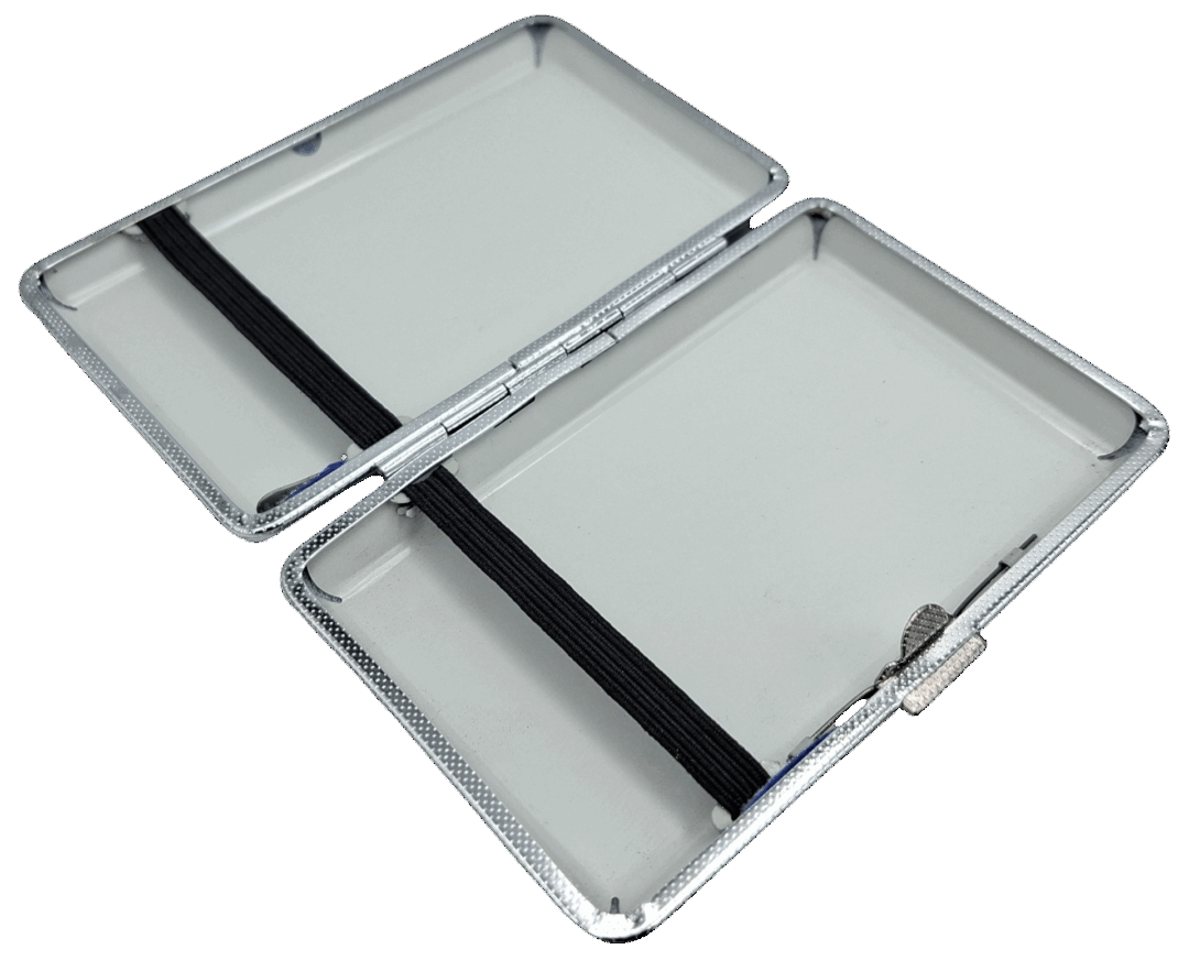 Oferta dotyczy papierośnicy widocznej na zdjęciach. Papierośnica mieści 20 papierosów cienkich. Ma gumki dzięki, którym papierosy są unieruchomione i nie latają w czasie przenoszenia papierośnicy. Jest metalowa i z zewnątrz pokryta sztuczną skórą. Wymiary papierośnicy to 10,8×6,8×1,9 cm.