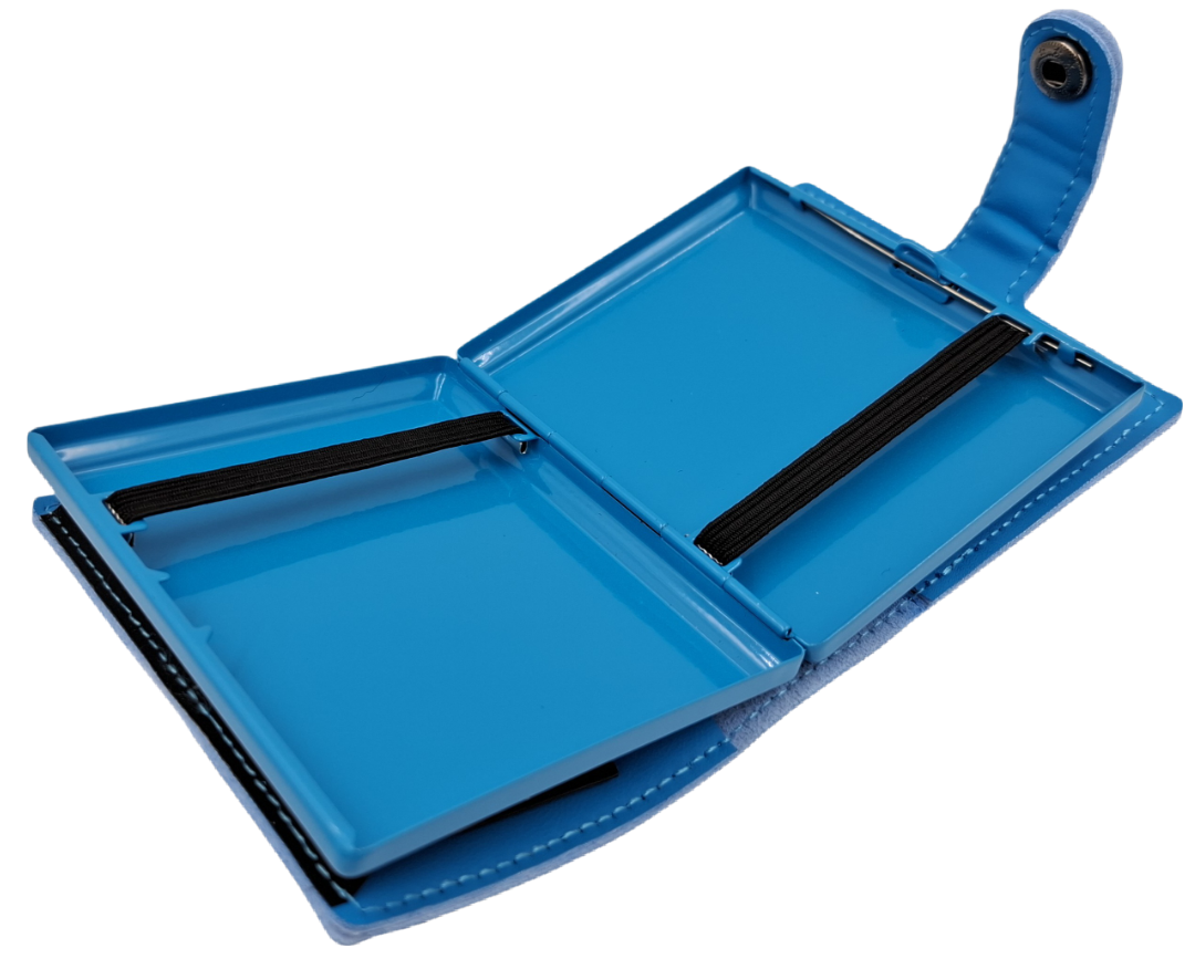 Oferta dotyczy metalowej papierośnicy znajdującej się w portfelu. Papierośnica mieści 18 papierosów. Posiada gumki dzięki którym papierosy są unieruchomione i nie latają w czasie przenoszenia papierośnicy. Idealnie nada się na prezent. Portfel wykonany jest z eko skóry. Posiada kieszenie na karty bądź gotówkę. Jego wymiary to 8,8×9,5×3,6 cm. Natomiast wymiary papierośnicy to 8×9,5×1,8 cm.