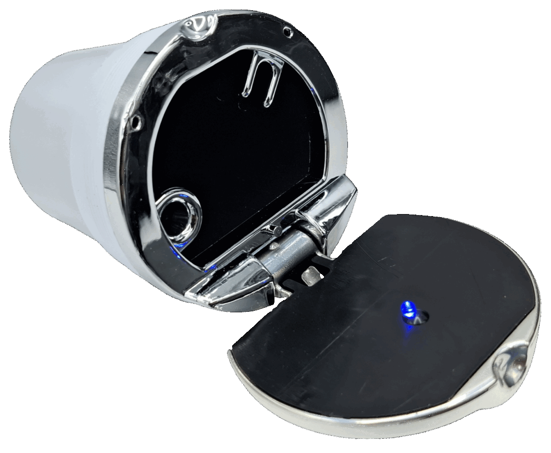 Oferta dotyczy popielniczki widocznej na zdjęciach. Posiada ona małe światełko niebieskie. Bateria jest nie wymienialna. Wykonana jest z plastiku. Wieczko się otwiera i zamyka. Idealnie nadaje się do samochodu. Wysokość popielniczki to 9,3 cm. Jej średnica u dołu to 5,7 cm. Natomiast na górze to 7,5 cm.