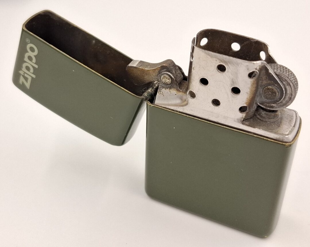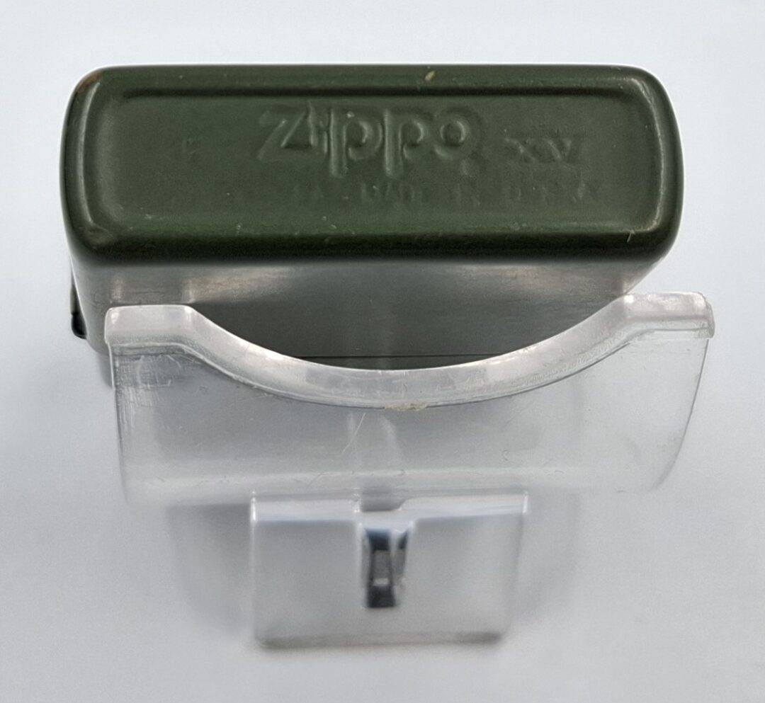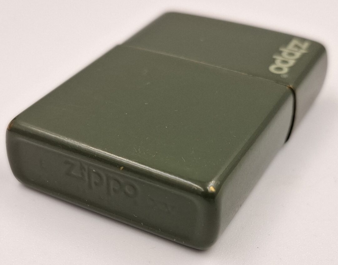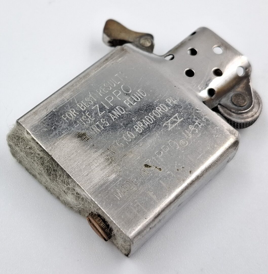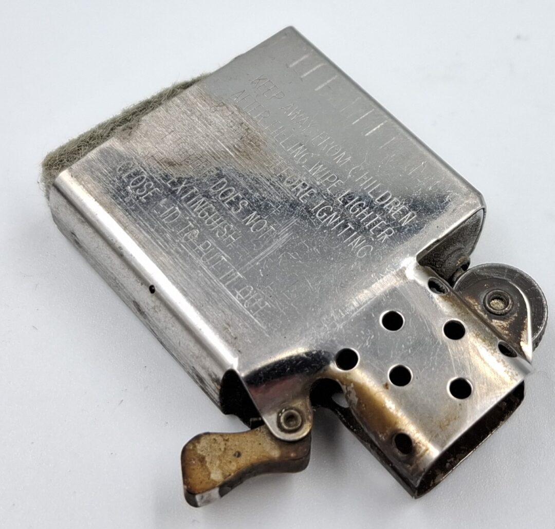 Zapalniczka nie działa. Ma ona też luz na zawiasie klapki przez co bardziej się rusza. Mechanizm iskrzenia działa. Może posiadać braki i uszkodzenia. Datowanie wkładu to rok 1999.