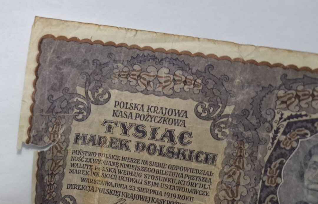 Oferta dotyczy banknotu 1000 marek Polskich z 1919 roku widocznego na zdjęciach. Banknot po prawej stronie jest przerwany.