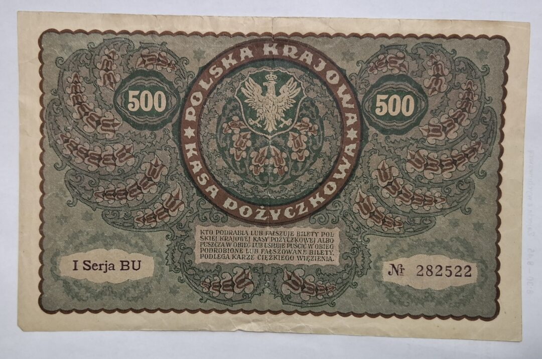 Oferta dotyczy banknotu 500 marek Polskich z 1919 roku widocznego na zdjęciach.