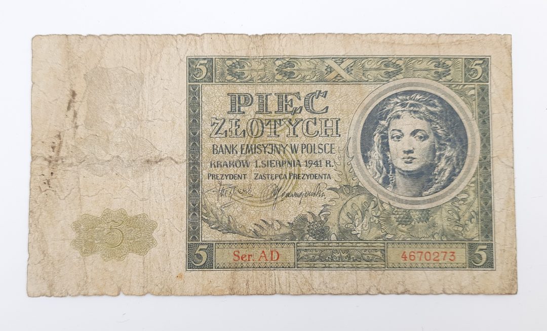 Oferta dotyczy banknotu 5 zł z 1941 roku widocznego na zdjęciach.