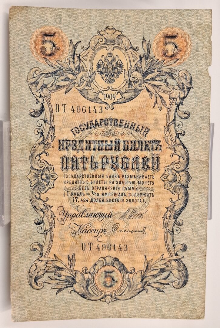 Oferta dotyczy banknotu 5 rubli z 1909 roku widocznego na zdjęciach.