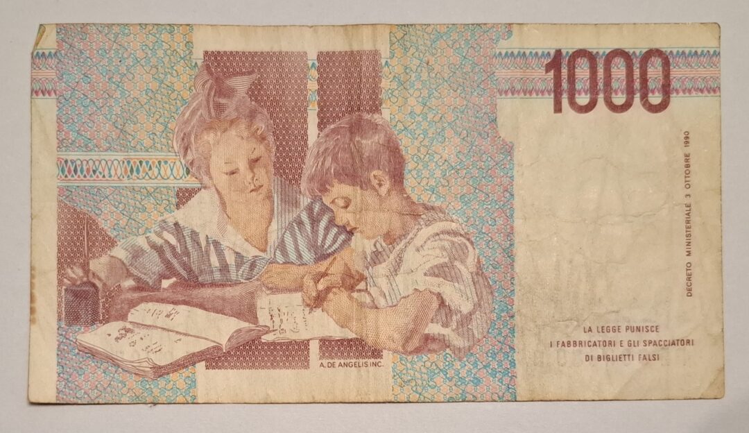 Oferta dotyczy banknotu 1000 Lirów z 1990 roku widocznego na zdjęciach.