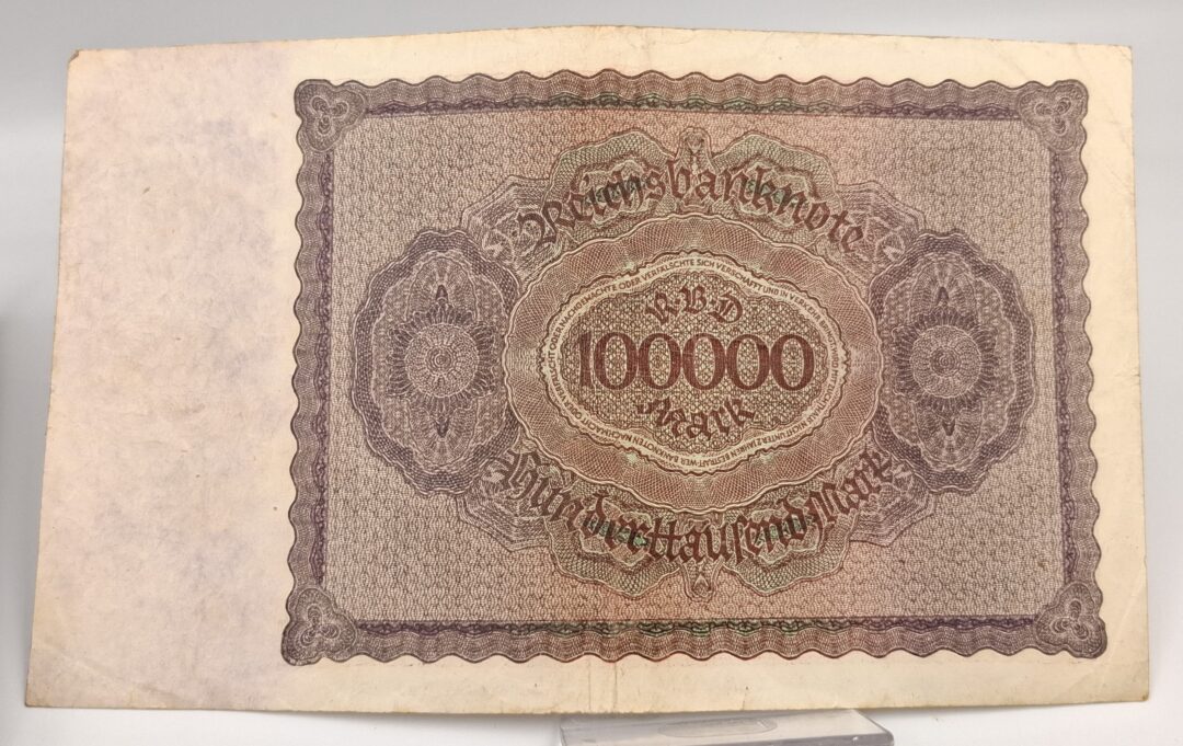 Oferta dotyczy banknotu 100000 marek z 1923 roku widocznego na zdjęciach.