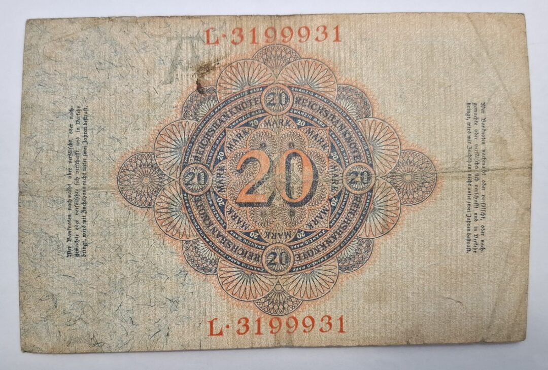 Oferta dotyczy banknotu 20 marek z 1910 roku widocznego na zdjęciach.