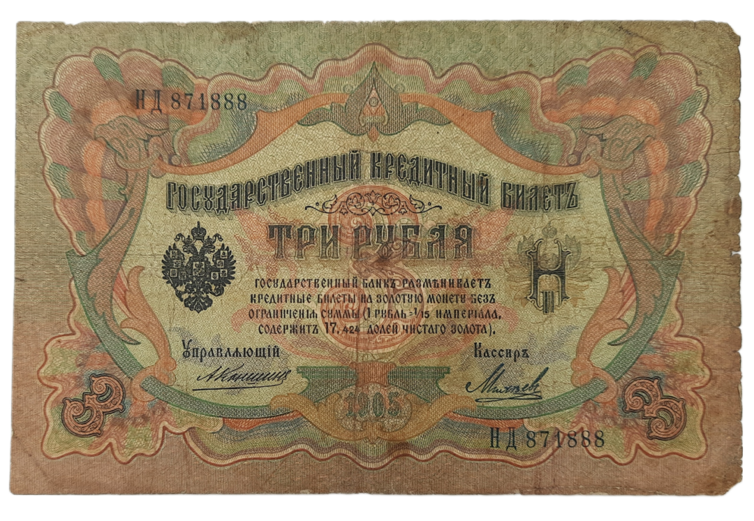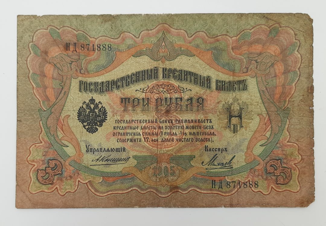 Oferta dotyczy banknotu 3 ruble z 1905 roku widocznego na zdjęciach.